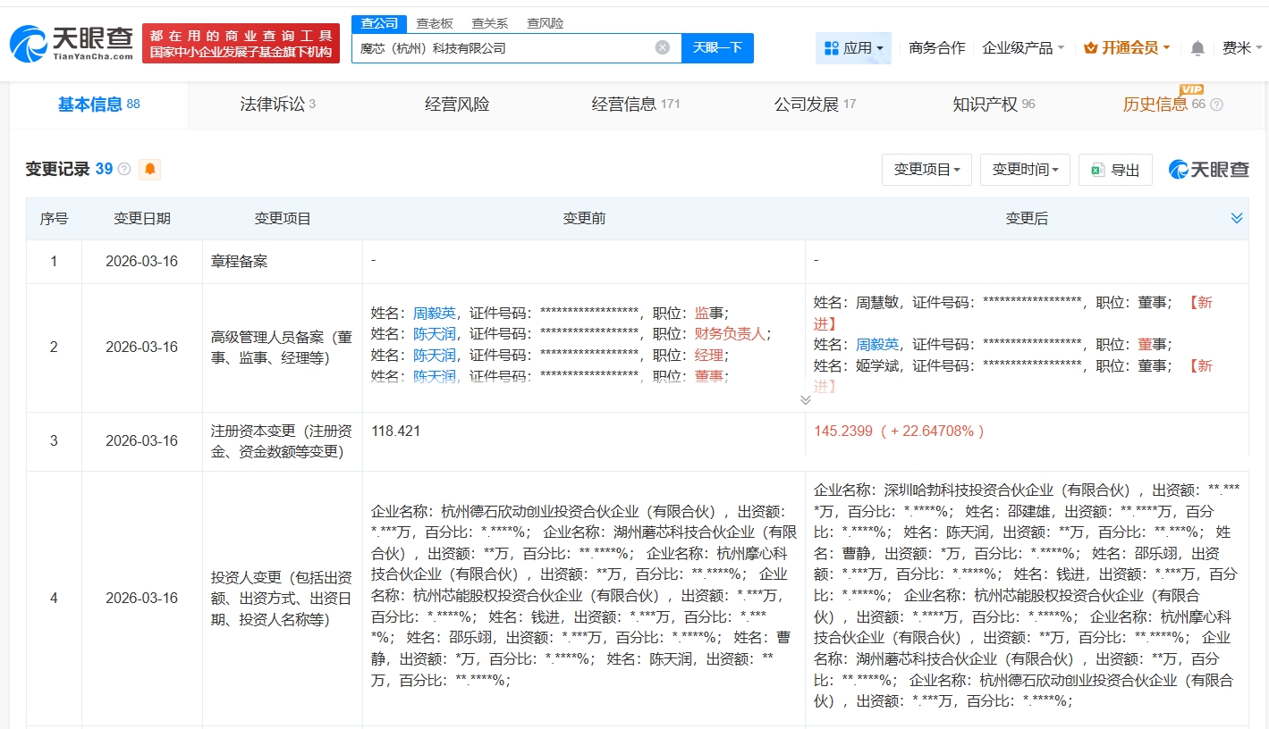雷达财经讯,天眼查工商信息显示,近日,魔芯(杭州)科技有限公司发生工商变更,新增华为旗下深圳哈勃科技投资合伙企业(有限合伙)、邵建雄为股东,同时,注册资本由约118万人民币增至约145万人民币,多位主要人员发生变更。