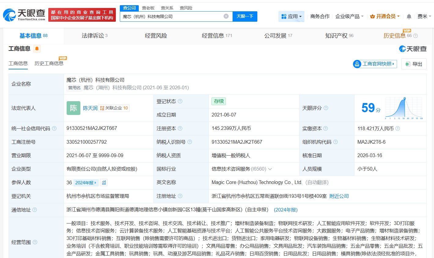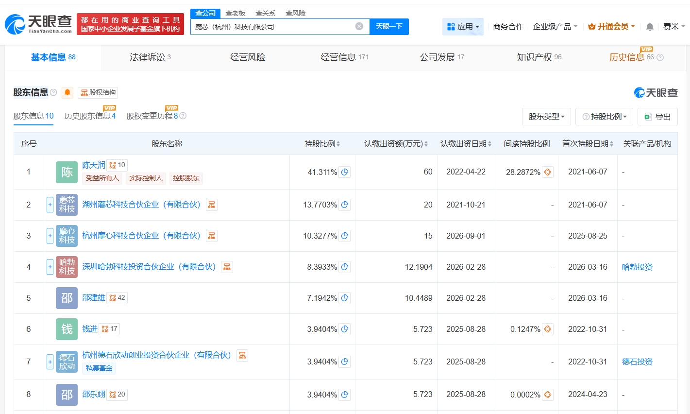 魔芯(杭州)科技有限公司成立于2021年6月,法定代表人为陈天润,经营范围含增材制造装备制造、人工智能应用软件开发、3D打印服务等。股东信息显示,该公司现由陈天润、湖州蘑芯科技合伙企业(有限合伙)及上述新增股东等共同持股。公开资料显示,该公司主营消费级3D打印机的研发、生产与销售,核心品牌为“KOKONI”。