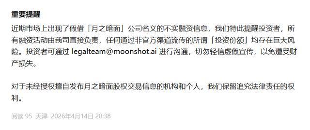 同时,月之暗面明确表示,公司所有融资活动均由自身直接负责,任何通过非官方渠道流传的所谓「投资份额」均存在巨大风险,提醒投资者切勿轻信虚假宣传,以免遭受财产损失。