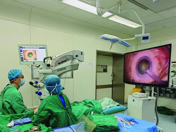 陈吉利主任(左)运用精准导航系统为患者做白内障手术。倪晓燕 拍摄