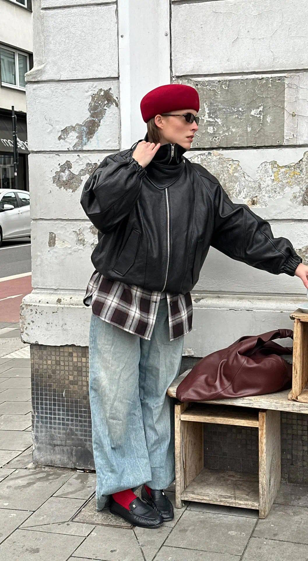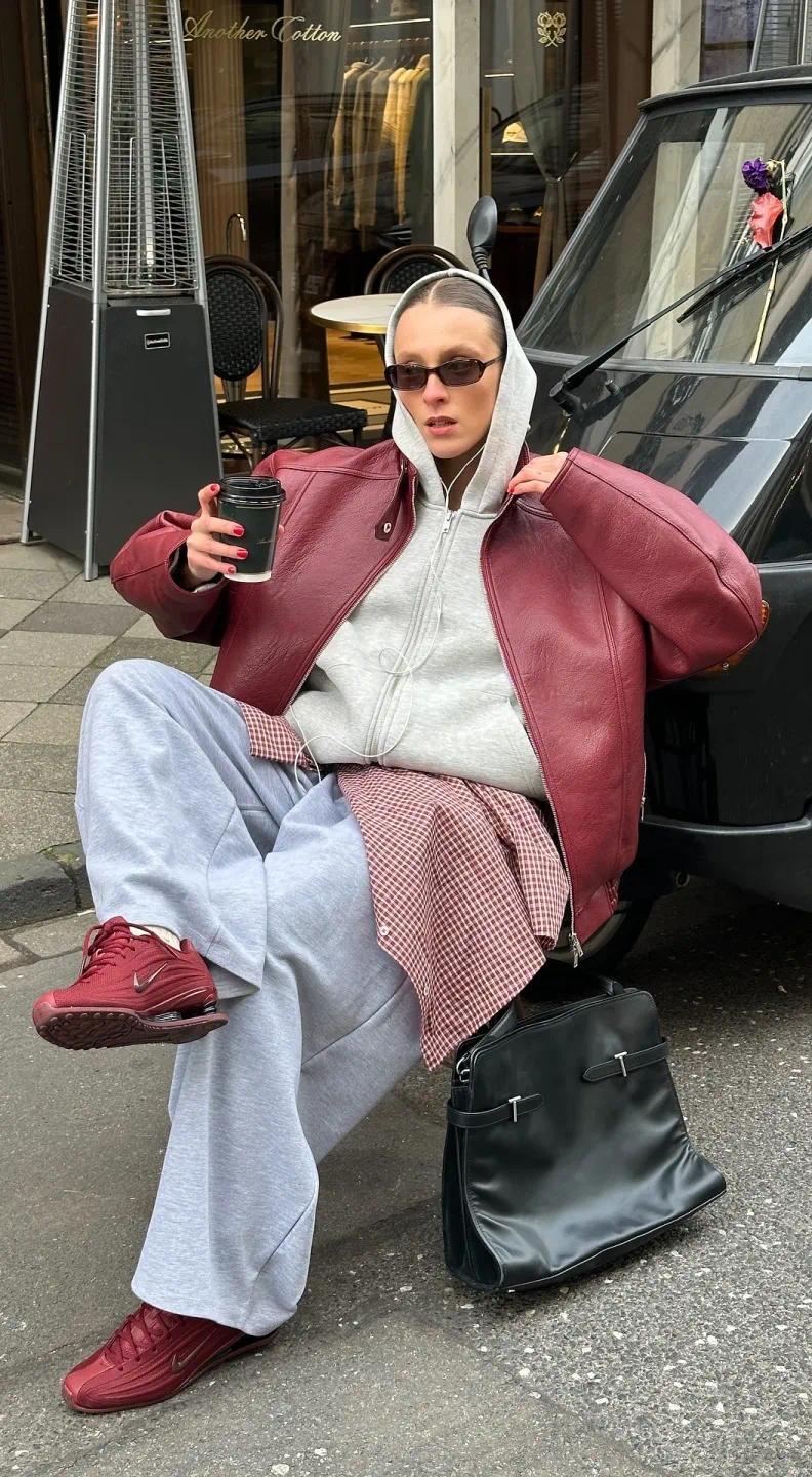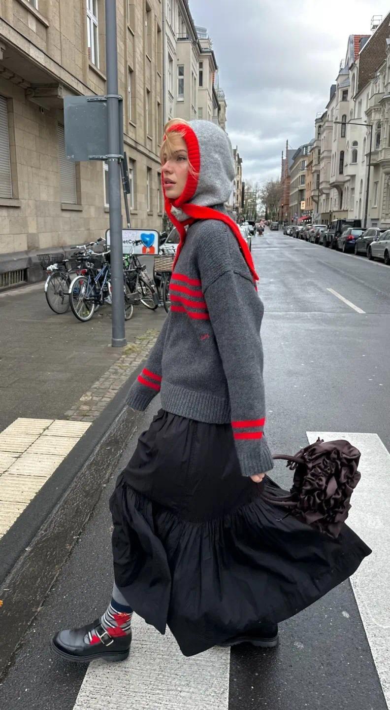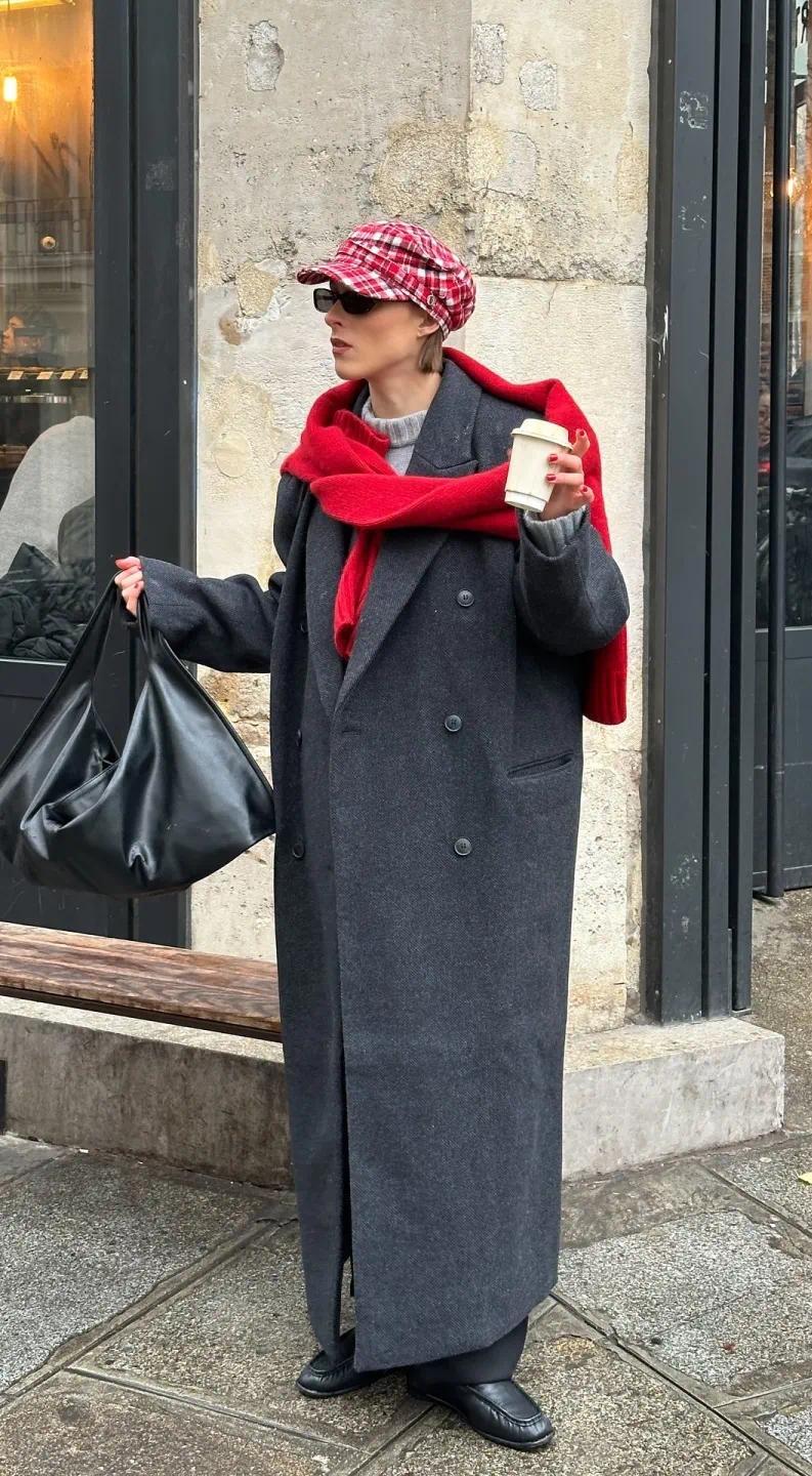 内层是基础的灰色,配饰就不基础,老己,试试给身上穿点红。