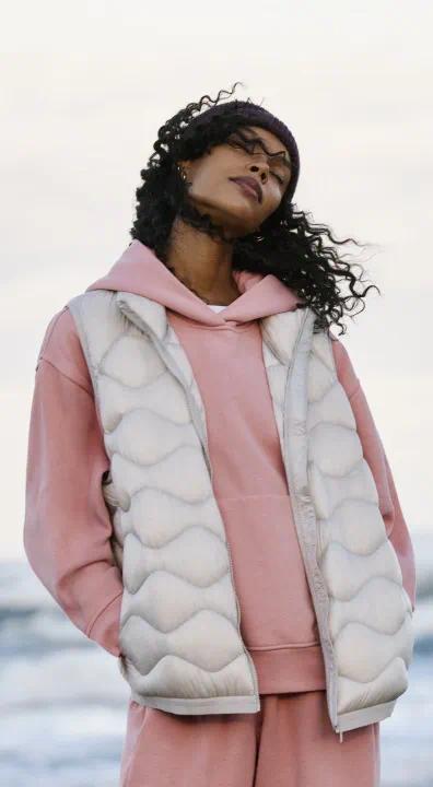 用淡色系的不同浓度,也能为叠穿增加层次感。含有内侧拉绒、舒适垂坠感的一件淡绿色系Brushed Softstreme™女士拉绒超宽松剪裁飞行员夹克,搭上同色高腰长裤,出门再随手套上一件Wunder Puff™女士短款羽绒外套,叠搭层次让整体造型看起来更加轻软柔和。
