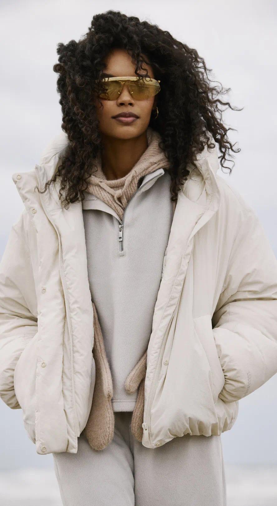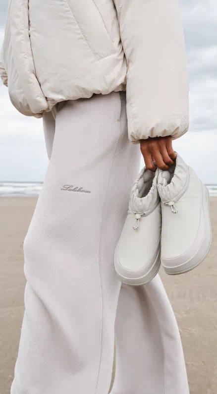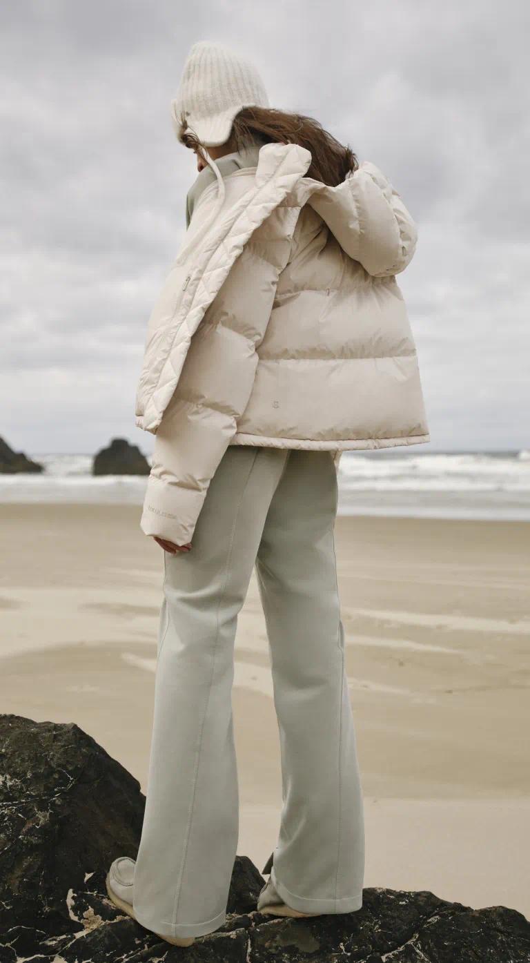 lululemon冬季上新的人气系列中刚好涵盖多款白色系单品,带来冬日纯净的温暖与舒适感。略带俏皮灵动感的lululemon Bubble-Hem 女士蓬松下摆羽绒外套搭配宽松抓绒的Plush Velour 女士卫衣套装,灰白色系配以不同材质的碰撞产生了微妙的色彩振动,点缀以棕色系手套、假领,增添细节和穿搭巧思,倍感温暖。